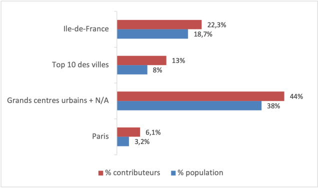 Le top 10 des villes françaises (Paris, Marseille, Lyon, Toulouse, Nice, Nantes, Montpellier, Strasbourg, Bordeaux, Lille) abrite ainsi 13% des contributions pour 8% de la population (+5 pts). La domination de l’Ile-de-France, vaste agglomération de 12,3 millions d’habitants en 2020, traduit le même phénomène : 22,3% des contributions (plus de 1/5) contre 18,7% de la population métropolitaine.