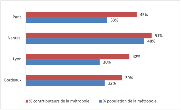 Avec des intensités variables, on observe le même phénomène pour la ville-centre de la métropole lyonnaise (42% des contributions pour 30% de la population, +12 pts) ou de la métropole nantaise (51% et 48%, +3 pts). Mais là encore, les autres communes de ces deux métropoles gardent un taux de participation relativement soutenu (proche de 2% dans les deux cas). Le même exercice peut être répété sur l’ensemble des métropoles françaises qui abritent au total près de 21 millions d’habitants, soit près d’un tiers de la population métropolitaine. Il conduit peu ou prou au même constat : surreprésentation de la ville-centre mais participation relativement soutenue des autres communes de la métropole.