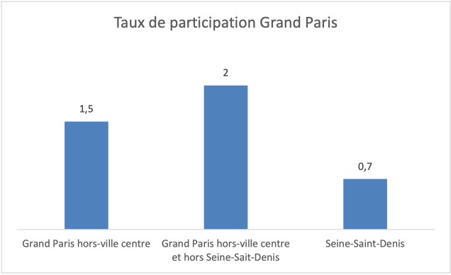 Dans la Métropole du Grand Paris, la situation est légèrement différente. La surparticipation des 20 arrondissements de la capitale est, on l’a vu, spectaculaire (33% de la population de la métropole mais 45% des réponses), mais le taux de participation dans le reste de la métropole est nettement plus modeste (1.54%). Cet écart est dû pour l’essentiel à la très faible participation des communes pauvres de Seine-Saint-Denis : dans la plupart des communes de ce département, le taux de participation est en effet inférieur à 0.8%… Au regard du taux de participation, la situation des villes pauvres du 93 ressemble à celle des quartiers pauvres de Marseille. Si l’on sort les communes de Seine-Saint-Denis du calcul, le taux de participation remonte à 2% dans le reste de la métropole.