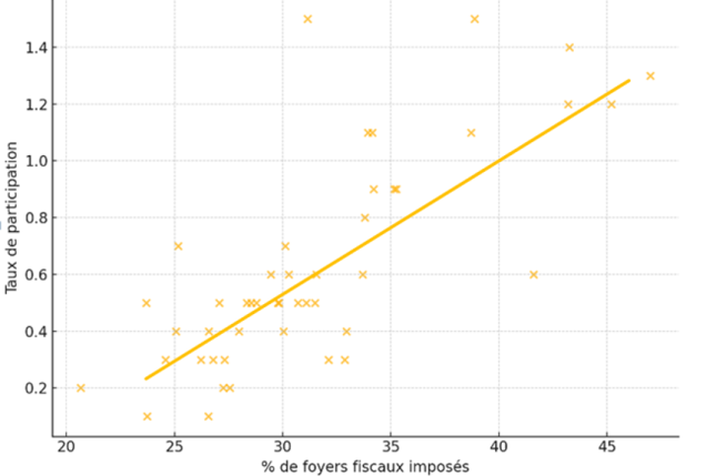 Corrélation entre % de foyers fiscaux imposés à l’IR et taux de participation au GD