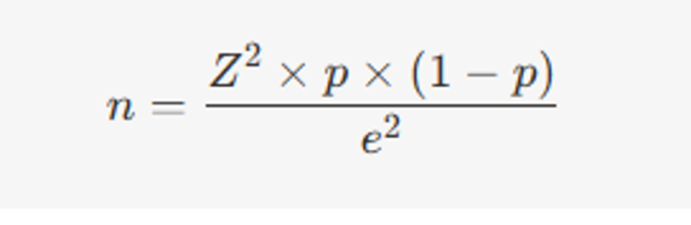 - p : Proportion estimée (par précaution, 0,5 est retenu car elle maximise la taille nécessaire de l’échantillon)