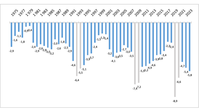 Le tableau joint recense l’évolution des déficits publics français en % du PIB, en maintenant en grisé les années où les finances publiques ont été confrontées à une crise atypique, qui a demandé des dépenses exceptionnelles non récurrentes, comme la crise Covid en 2020 et 2021 (arrêt de toutes les activités pendant quelques semaines et subventions massives pour le maintien de l’appareil productif) ou qui a enregistré l’impact en recettes d’une récession brutale, comme en 1993–1994 (crise du SME, les taux d’intérêt montent au ciel, le chômage aussi, récession la plus forte depuis 1945) ou qui a cumulé les deux effets comme la grande crise financière 2008–2009 (effondrement du crédit bancaire et nécessité de soutenir le système financier, puis plan de relance des années suivantes). Il est normal que, dans une logique contracyclique, les déficits publics explosent provisoirement dans ces occasions absolument exceptionnelles, à condition de revenir à la normale dans les années suivantes ; et il ne fait pas de doute que nous sommes revenus depuis 2022 dans un régime de croissance correspondant à la moyenne des dernières années.