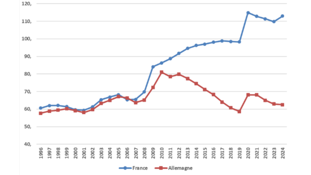 Dette publique en % du PIB : France et Allemagne depuis 199