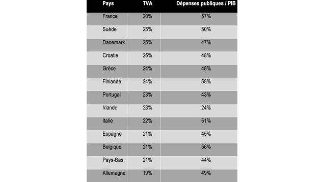 Tous les pays d’Europe qui ont des taux de dépenses/PIB supérieurs à 50% ont des taux de TVA plus élevés : 25% en Suède, 25% au Danemark, 24% en Finlande ; tous les pays qui ont connu des difficultés financières ont également des taux TVA plus élevés : 24% en Grèce, 23% au Portugal, 23% en Irlande, 22% en Italie. En clair : la France est 3 à 5 points en dessous, en moyenne, des pays comparables.