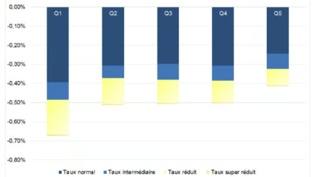 Certes, il n’est pas redistributif. Il est même un peu contre-redistributif, surtout sur les taux des produits de base, alimentation, etc., parce que les plus bas revenus consomment une part plus importante de leurs revenus, et une part plus importante de leur consommation est taxée au taux super-réduit. Ainsi l’étude mentionnée de la direction du Trésor calcule-t-elle qu’une hausse d’un point de tous les taux entrainerait une baisse de pouvoir d’achat de 0,7% du premier quartile contre 0,4% du dernier :