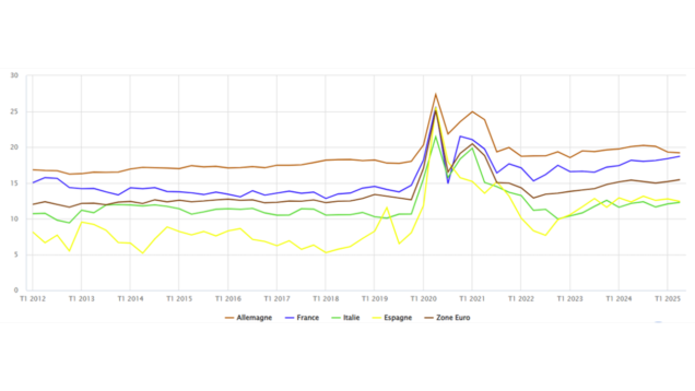 Sur le long terme, le taux d’épargne des ménages français tournait autour de 14–15% du revenu depuis les années 1990. Il est monté jusqu’à 20% pendant le Covid, où les gens ne pouvaient pas sortir de chez eux alors que leurs revenus étaient préservés. Mais il n’est pas revenu depuis sur la norme historique, et au contraire, il remonte en 2024 et 2025, à 18.2% en 2024, puis 18.4% au premier trimestre 2025, et 18.7% au deuxième trimestre[46].