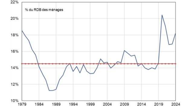 Sur le long terme, le taux d’épargne des ménages français tournait autour de 14–15% du revenu depuis les années 1990. Il est monté jusqu’à 20% pendant le Covid, où les gens ne pouvaient pas sortir de chez eux alors que leurs revenus étaient préservés. Mais il n’est pas revenu depuis sur la norme historique, et au contraire, il remonte en 2024 et 2025, à 18.2% en 2024, puis 18.4% au premier trimestre 2025, et 18.7% au deuxième trimestre[46].
