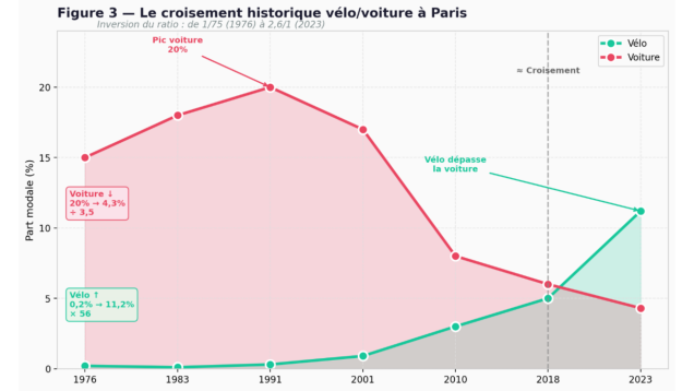 Et si l’on se focalise sur le poids relatif du vélo et de la voiture à Paris, on voit qu’en 2018 les deux modes sont au même niveau, et qu’en 2023 la part du vélo dépasse nettement celle de la voiture pour les déplacements des Parisiens.