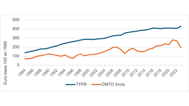 Évolutions de la TFPB et des DMTO par logement sur la période 1984–2023