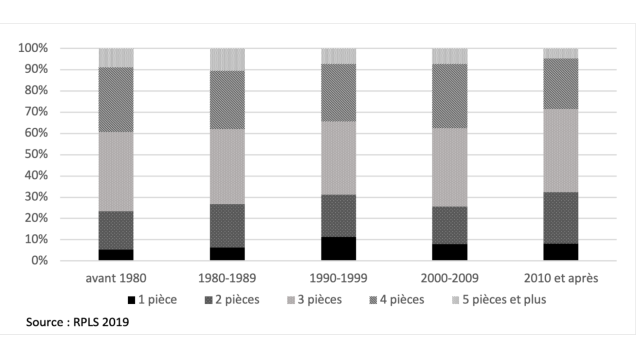 Les ménages avec enfants ne représentaient en 2013 plus que 40 % de l’ensemble des locataires, contre 53 % en 2004. La part des personnes seules dans l’ensemble des ménages occupants est passée de 23 % en 1984 à 41 % en 2013. Or le parc locatif social, destiné à l’origine à accueillir surtout des familles, reste composé très majoritairement (73 % en 2022) de logements de trois pièces ou plus. Qui plus est, la structure de la production n’a guère évolué avec le temps, comme le montre la figure 2.